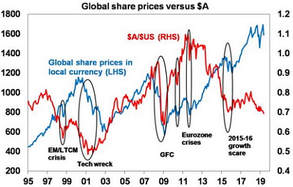 Second, if the global outlook turns sour due to say Trump’s trade wars, having an exposure to foreign currency provides protection for Australian investors as the $A usually falls in response to threats to global growth. As can be seen in the next chart there is a rough positive correlation between changes in global shares in their local currency terms and the $A. Major falls in global shares associated with the emerging market/LTCM crisis in 1998, the tech wreck into 2001, the GFC, the Eurozone crises and the 2015-16 global growth scare saw sharp falls in the $A. So being short the $A and long foreign exchange provides good protection against threats to the global outlook.