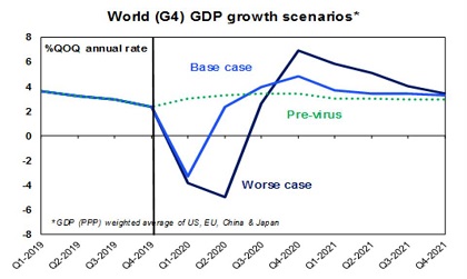 • A worse case downturn that sees global growth contract in the March quarter (led by a sharp contraction in China) and the June quarter as (as developed countries get badly hit) resulting in a global recession to be then followed by a rebound as life returns to normal led by China.