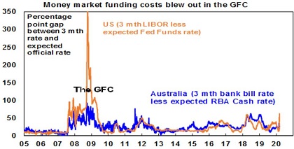 • Measures of market stress, eg, bank funding costs as measured by the gap between 3-month rates and central bank rates. These have risen but are well below GFC levels.