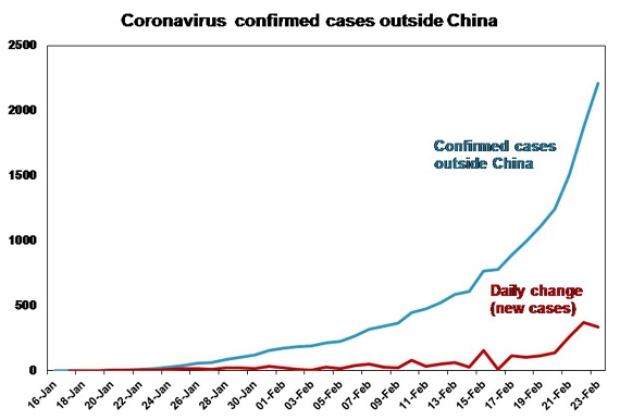Our assessment three weeks ago saw as our base case with 75% probability that the outbreak would be contained within the next month or two. This could still see more downside in share markets & bond yields but there would be a rebound by the June quarter as growth rebounds. The downside case saw a full-blown pandemic with delayed containment resulting in sharp drawn out slump in economic activity, the risk of recession and a 20% or so fall in share markets with the $A falling to around $US0.60. Of course, there are lots of variations around this. We thought the key things to watch are the daily number of new cases and the spread of new cases in developed countries.