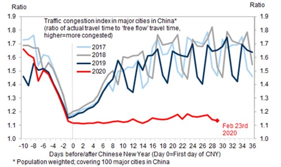 Some estimates suggest that as much as 50% of China’s economy has been locked down for the last three weeks which means nearly 12% knocked off Chinese GDP this quarter. While the Chinese Government is refocussing on efforts to restore economic activity outside Hubei and high-risk areas, so far there is only mixed evidence of that. Coal consumption at power stations, migrant flows to cities, property sales and steel demand are up from their lows but remain well below normal levels for this time of year. And there has been no pickup in traffic congestion.