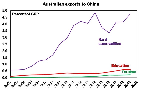 Australian GDP is likely to go backwards this quarter (with our current estimate being -0.1%) thanks to the bushfires and the hit from coronavirus. The vulnerability of the Australian economy to China is apparent from the next chart. Exports to China make up nearly 9% of Australia’s GDP including hard commodities at nearly 5%, tourism at 0.2% and education at 0.6%. For other major countries it’s less than 3%. Chinese tourist arrivals stopped with the travel ban, education is under threat although there is a bit more time and bulk commodity shipments are showing signs of being impacted (although this has been distorted by storms). Clearly the longer it drags on and the more the outbreak and disruption spreads globally the bigger the impact on Australia including the risk of two negative quarters, ie recession. The rising threat to the Australian economy from coronavirus is adding to the likelihood that the RBA will cut rates in March or April and the pressure for more fiscal stimulus in the May budget is increasing.