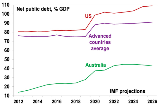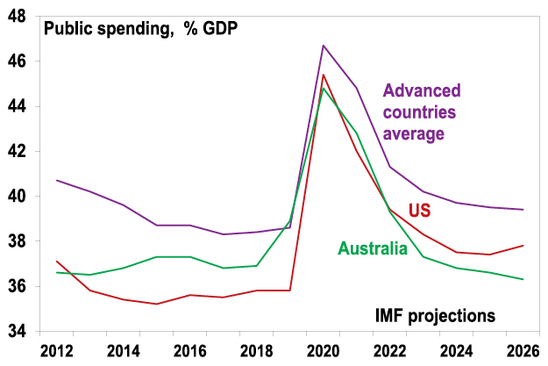 The GFC brought an end to support for economic rationalism and was associated with a leg up in public debt levels. Fading memories of the problems of too much government intervention in the 1970s added to this. The coronavirus crisis has added to support for bigger government intervention in economies and the tolerance of higher levels of public debt. Particularly given that the pandemic has enhanced perceptions of inequality and that governments should do more to boost infrastructure spending & bring production of key goods back onshore. And it’s now combining with a desire for governments to pick and subsidise climate “winners” rather than rely on a carbon price to achieve net zero emissions. IMF projections for government spending in advanced countries show it settling 1% of GDP higher in five years’ time than pre-covid levels.