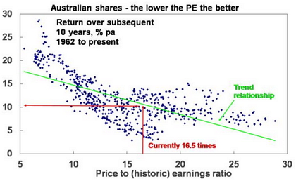 The cheaper you buy an asset the higher its prospective return. Guides to this are price to earnings ratios for share markets (the lower the better – see the next chart) and yields, ie the ratio of dividends, rents or interest payments to the value of the asset (the higher the better). Flowing from this it follows that yesterdays winners are often tomorrows losers – because they became overvalued and over loved and vice versa. But while this seems obvious, the reality is that many find it easier to buy after shares have had a strong run because confidence is high and sell when they have had a big fall because confidence is low. But the key point is that the more you pay for an asset the lower its potential return and vice versa.