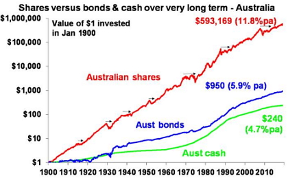 This one goes way back to my good friend Dr Don Stammer. One dollar invested in Australian cash in 1900 would today be worth $240 and if it had been invested in bonds it would be worth $950, but if it was allocated to Australian shares it would be worth $593,169. Although the average annual return on Australian shares (11.8% pa) is just double that on Australian bonds (5.9% pa) over the last 119 years, the magic of compounding higher returns leads to a substantially higher balance over long periods. Yes, there were lots of rough periods along the way for shares as highlighted by arrows on the chart, but the impact of compounding at a higher long-term return is huge over long periods of time. The same applies to other growth-related assets such as property.