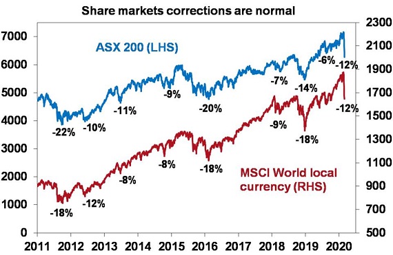 The plunge in share markets over the last week has generated much coverage and consternation. This is understandable given the rapidity of the falls – with US shares having their fastest 10% fall from an all-time high on record – and the uncertainty around the coronavirus (Covid-19) and its impact on economic activity. From their highs to recent lows US shares have fallen 13%, Eurozone shares have fallen 16%, Japanese and Chinese shares have fallen 12% and Australian shares have fallen 12%. This note looks at the issues for investors and puts the falls into context.