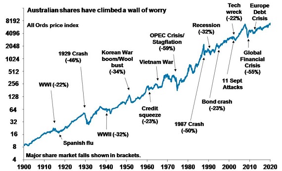 Related to this, shares climb a wall of worry over many years with numerous events dragging them down periodically, but with the long-term trend ultimately up & providing higher returns than other more stable assets. Bouts of volatility are the price we pay for the higher longer-term returns from shares.