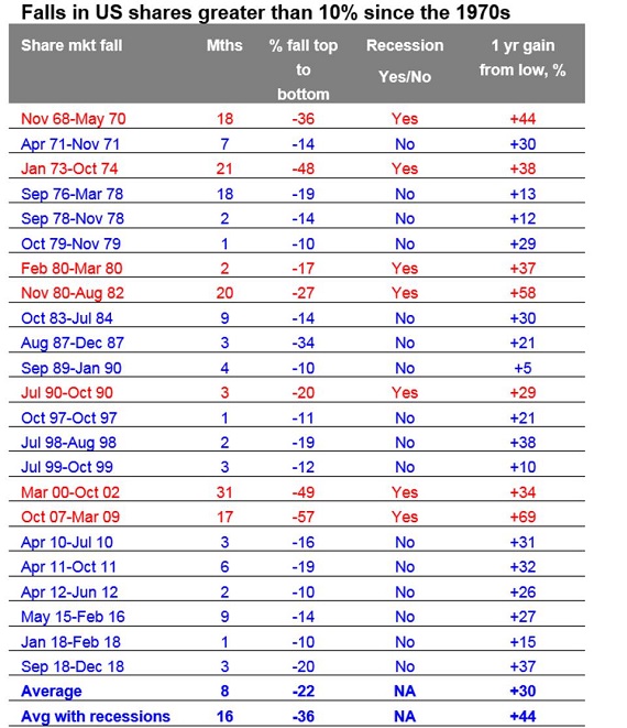 Second, the main driver of whether we see a correction (a fall of 5% to 15%) or even a mild bear market (with say a 20% decline that turns around relatively quickly like we saw in 2015-2016) as opposed to a major bear market (like that seen in the global financial crisis (GFC)) is whether we see a recession or not – notably in the US as the US share markets tends to lead for most major global markets. The next table shows US share market falls greater than 10% since the 1970s. I know it’s heavy – but I like this table! The first column shows the period of the fall, the second shows the decline in months, the third shows the percentage decline from top to bottom, the fourth shows whether the decline was associated with a recession or not and the fifth shows the gains in the share market one year after the low. Falls associated with recessions are highlighted in red.