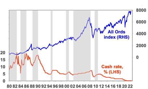 Secondly, rising interest rates are only really a major problem for shares when rates reach onerous levels (ie, above “normal”), contributing to an economic downturn, eg, in 1981-early 1982, late 1989 and in late 2007 to early 2008. They are also a problem when rate hikes are aggressive, as in 1994 when the cash rate was increased from 4.75% to 7.5% in four months.