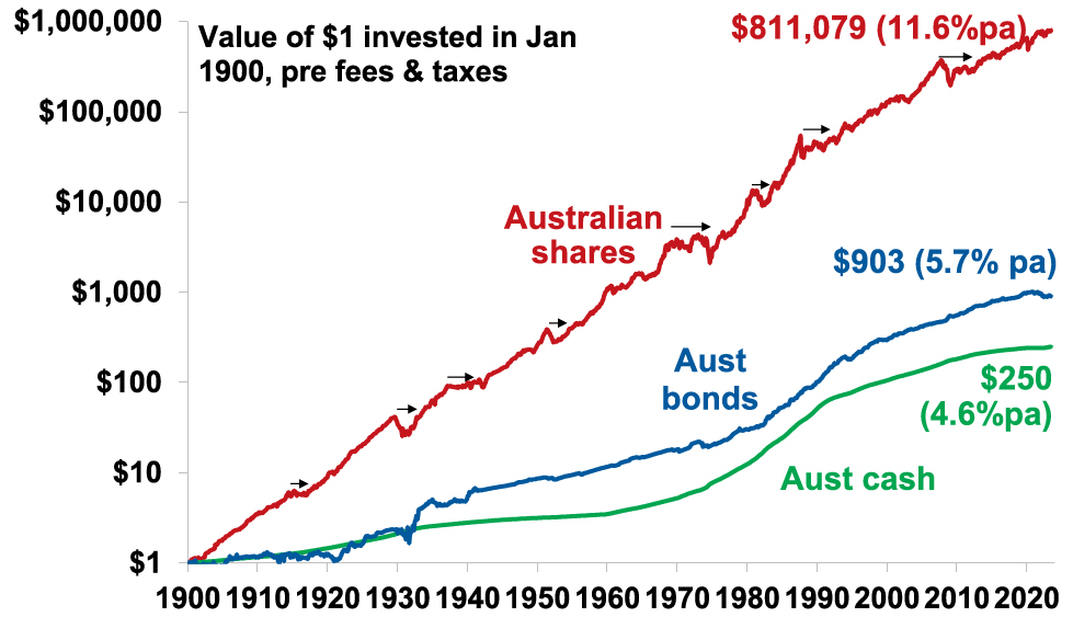 Secondly, the history of share markets (and other growth assets like property) in developed well managed countries with a firm commitment to the rule of law has been one of the triumph of optimists. Sure, share markets go through bear markets and often lengthy periods of weakness – where pessimists get their time in the sun – but the long-term trend has been up, underpinned by the desire of humans to find better ways of doing things resulting in a real growth in living standards. This is indicated in the next chart which tracks the value of $1 invested in Australian shares, bonds and cash since 1900 with dividends and interest reinvested along the way. Cash is safe and so fine if you are pessimistic but has low returns and that $1 will have only grown to $250 today. Bonds are better and that $1 will have grown to $903. Shares are volatile (and so have rough periods – see the arrows) but if you can look through that they will grow your wealth and that $1 will have grown to $811,079.