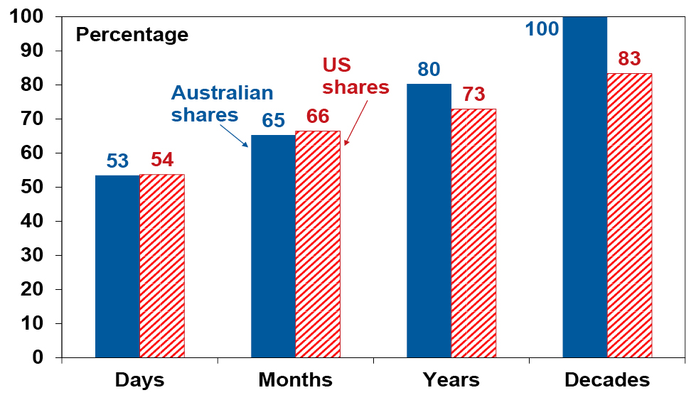 On a day-to-day basis it’s around 50/50 as to whether shares will be up or down, but since 1900 shares in the US have had positive returns around seven years out of ten and in Australia it’s around eight years out of ten.