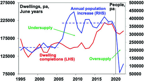 Annual population growth surged from around 2005 with average population growth rising from around 215,000 pa over the decade to 2005 to 370,000 over the 2006 to 2019 period, which would have implied roughly the need for an extra 50,000 dwelling per annum but supply did not start to catch up until after 2015, which led to a chronic undersupply of housing.