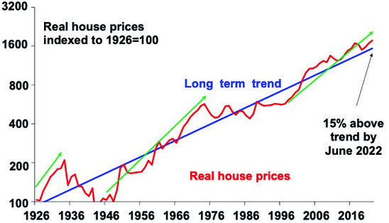 The next chart shows real Australian home prices (average property prices after removing increases in consumer price inflation) indexed to start in 1926 at 100 (red line) against their long-term trend (blue line).