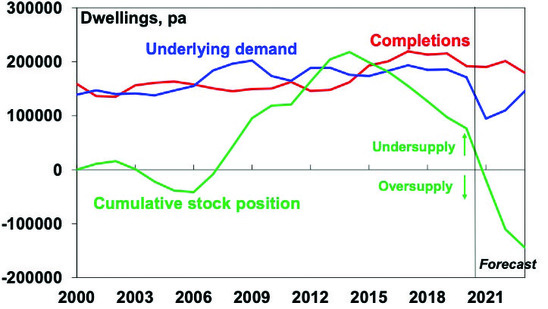 Second, the chronic under supply of property may be starting to fade thanks to the unit building boom since 2015, the hit to immigration and home building incentives which are likely to keep house building high for the next 12 months at least. As evident in the last chart, supply is likely to remain strong this year and next, but population growth has collapsed implying a shift from property undersupply last decade to oversupply. This can also be seen in the next chart which shows our estimate of underlying demand for housing (blue line) based on population growth and demolitions versus completions of new dwellings (red line). The cumulative balance is shown with the green line and indicates that the surge in underlying demand from 2006 led to an undersupply of more than 200,000 dwellings by 2013. The collapse in population growth has likely now seen this move back to balance and if population growth remains as weak as the Government is projecting over the next two years, and construction stays up, we will move into a clear oversupply. This will be healthy in terms of improving housing affordability for new buyers and renters.