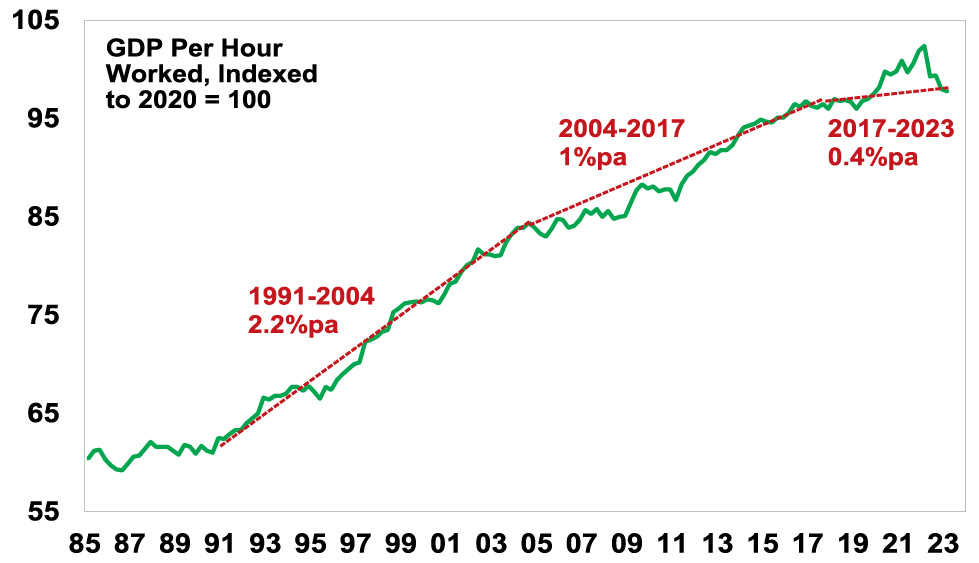 Productivity refers to the level of economic output for a given level of labour and capital inputs. Increased productivity means more is being produced for given inputs. Output usually refers to Gross Domestic Product and dividing inputs of labour (hours worked) and capital (structures and machinery) into GDP gives “multi factor productivity”. However, its more common to refer to measures of labour productivity, ie, GDP per hour worked. The next chart shows this for Australia.